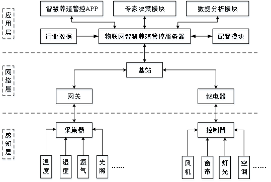 本虚拟仿真实验再现了物联网智慧养殖管控的真实场景,还原了物联网拓扑结构搭建、基础设备、通信方式、传感器集成、传感器部署、数据分析、APP和系统架构设计等关键技术环节,共计15个实验操作步骤。在实验设计上,着重体现“交互式操作”的实验设计理念,重点展示物联网应用感知层、网络层和应用层三层体系架构,如图42所示。