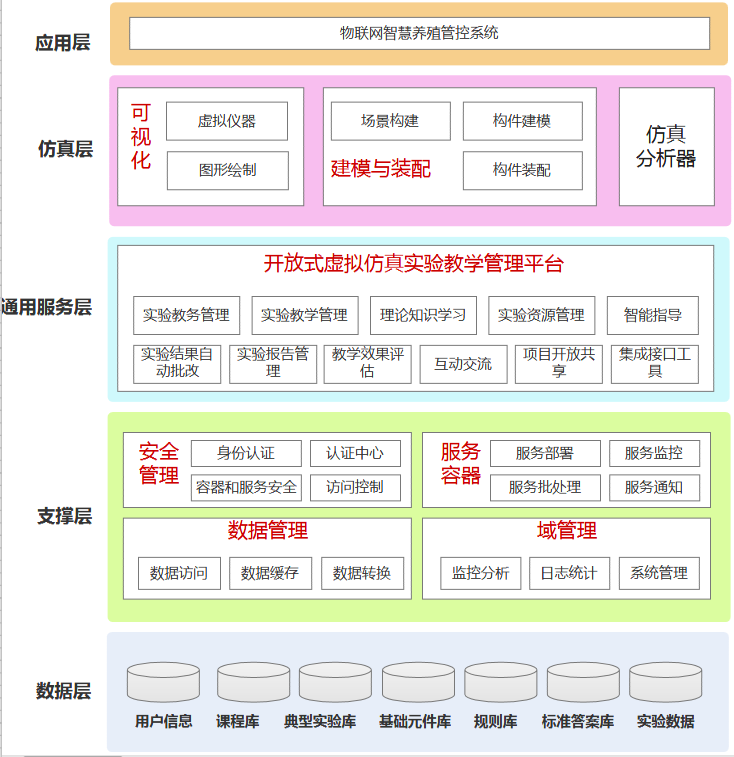 基于底层的服务,最终物联网智慧养殖管控系统虚拟仿真实验项目教学与开放共享。该框架的应用层具有良好的扩展性,实验教师可根据教学需要,利用服务层提供的各种工具和仿真层提供的相应的器材模型,设计各种典型实验实例,最后面向学校开展实验教学应用。